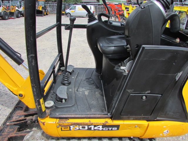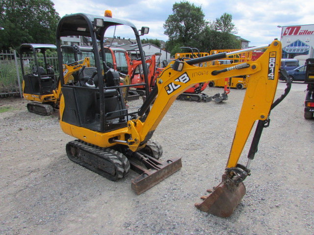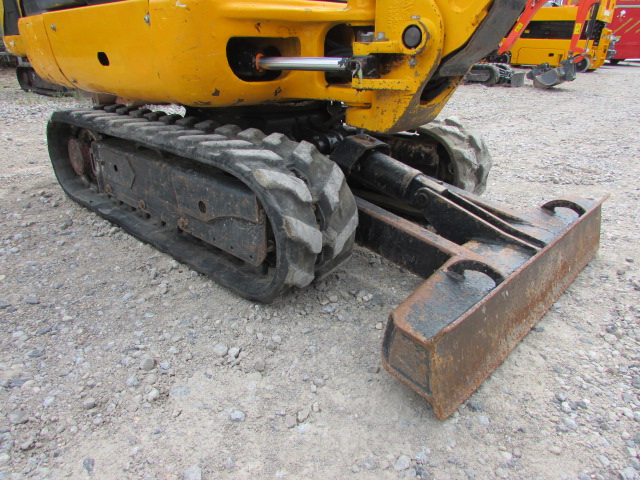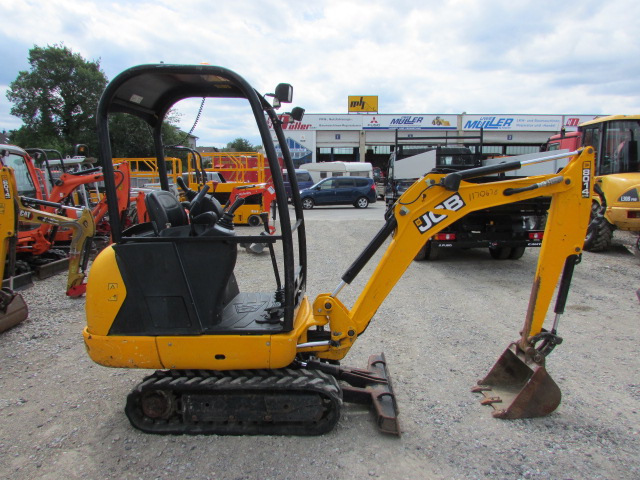 JCB 8014 Baujahr 2015, 1423 h, Betriebsgewicht 1481 kg, 14,7 kW, Arbeitsscheinwerfer, hydraulische Zusatzleitung, 1 Grabenräumlöffel, 2 Tieflöffel, Gummikette 60 %, Schutzdach / Canopy