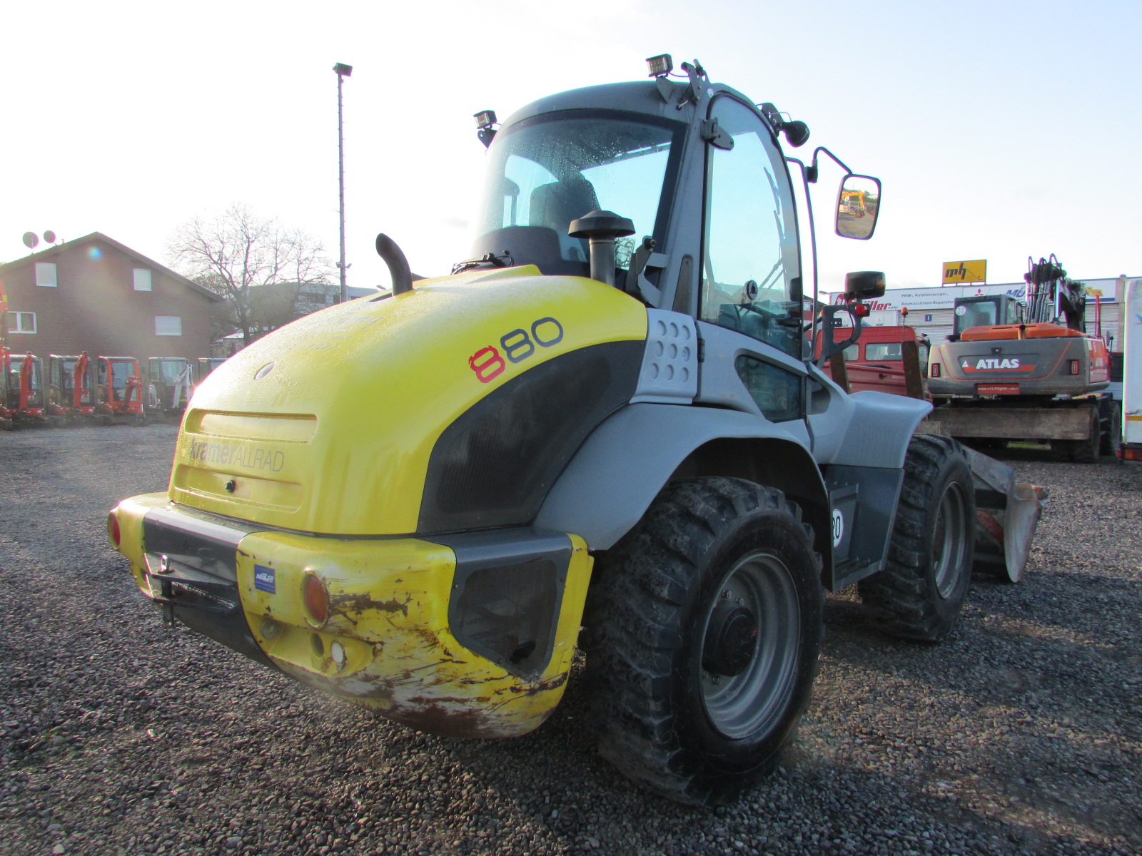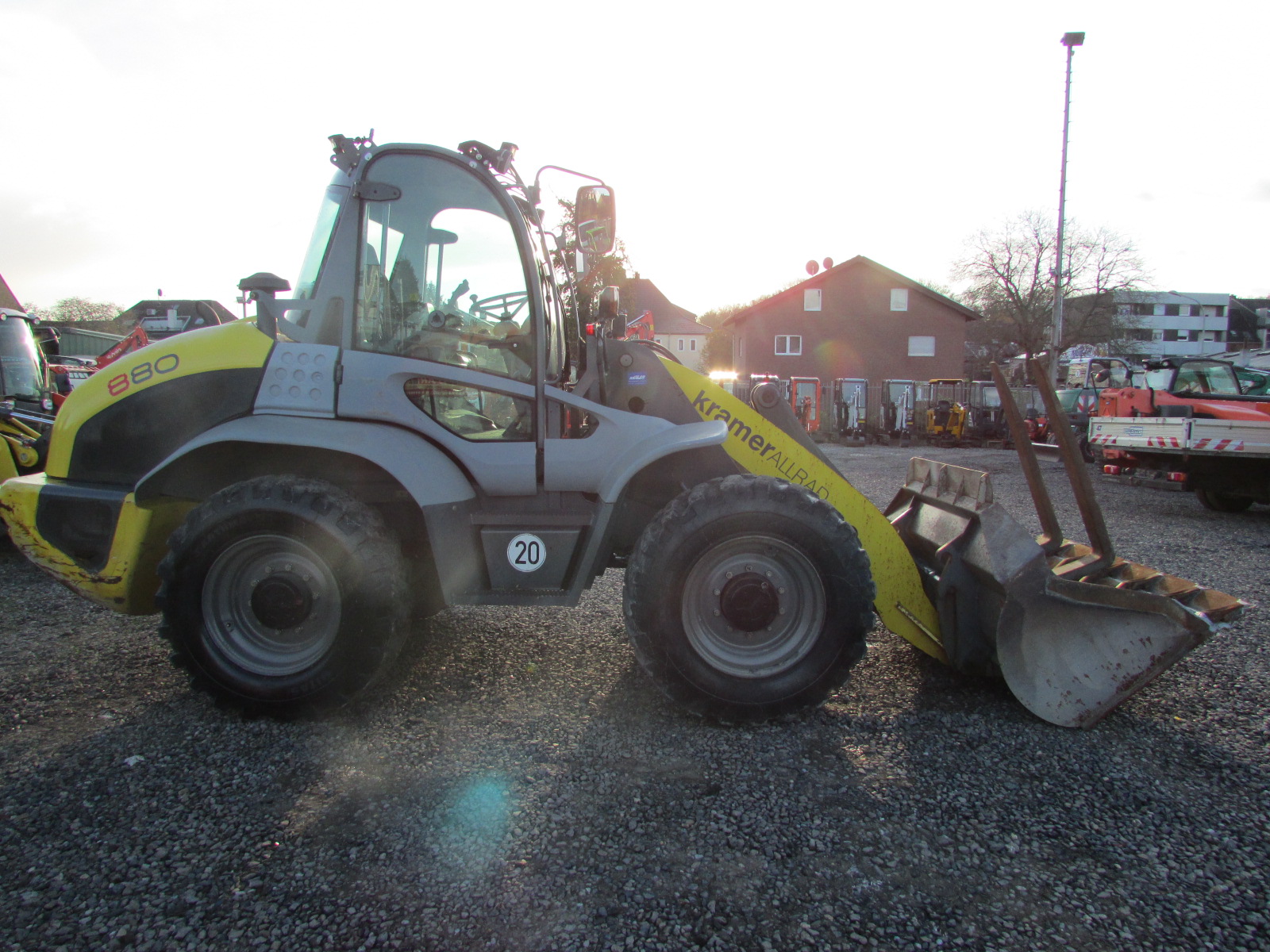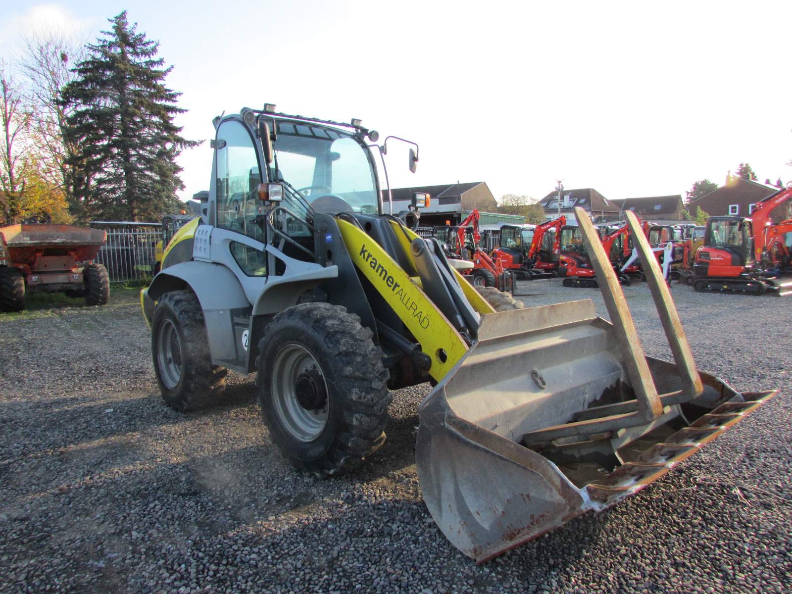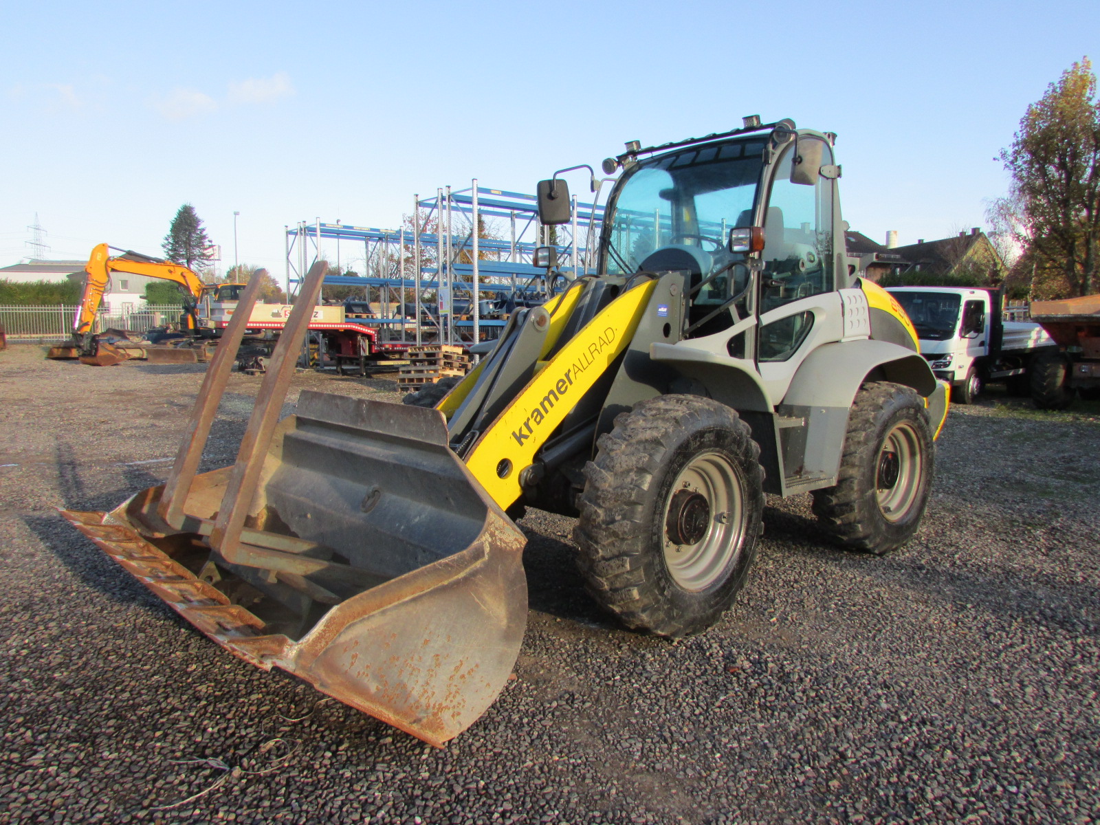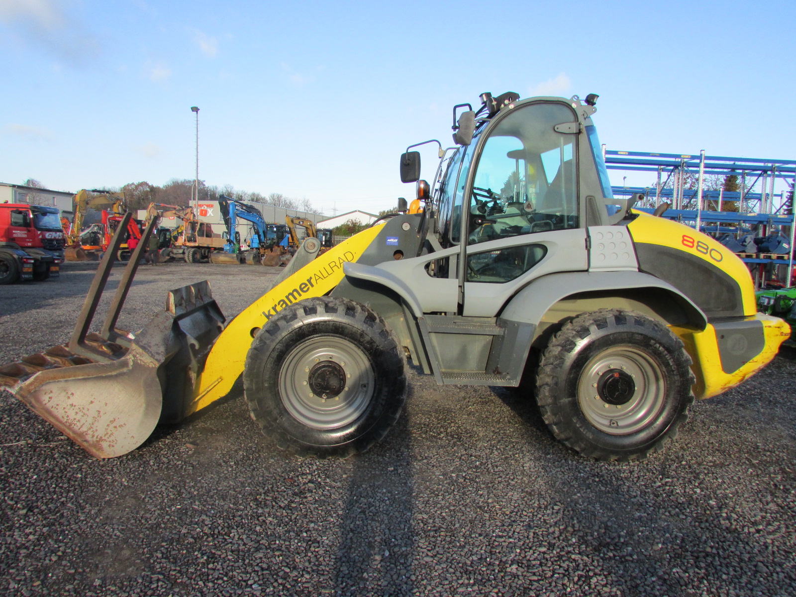 Kramer 880 Baujahr 2010, 1740 h, Kombigerät erneuert bei 2771 h, Betriebsgewicht 8.100 kg, Motorleistung 88 kW, Deutz Motor, hydraulischer Schnellwechsler, 3. Steuerkreis, Palettengabel, Schaufel, Allradlenkung, 2 Lenkarten, LED Arbeitsscheinwerfer,