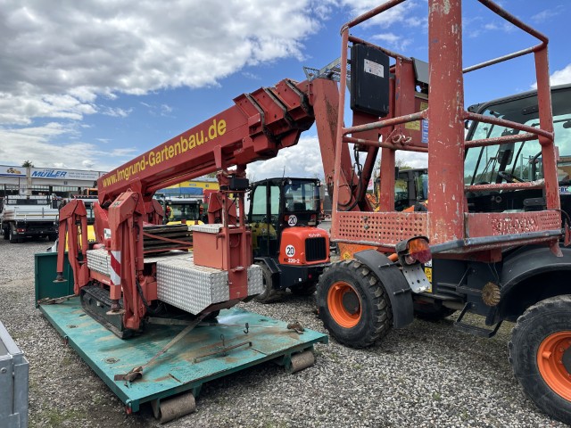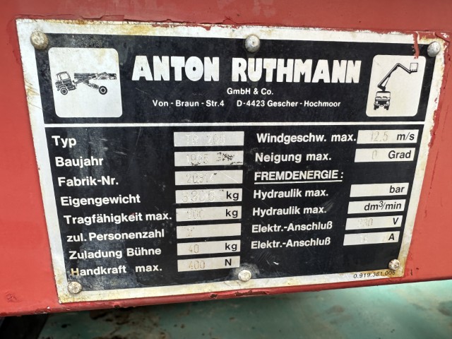 Ruthmann TR 200 Ketten Arbeitsbühne Baujahr 1995, Eigengewicht 3300 kg, 2 Personen, Tragfähigkeit 230 kg, 4-fach abgestützte Raupenbühne, Hatz Diesel, Motorleistung 15kW, Arbeitshöhe 20 m, seitliche Reichweite ca. 15 m, optional mit Plateau zum Transport