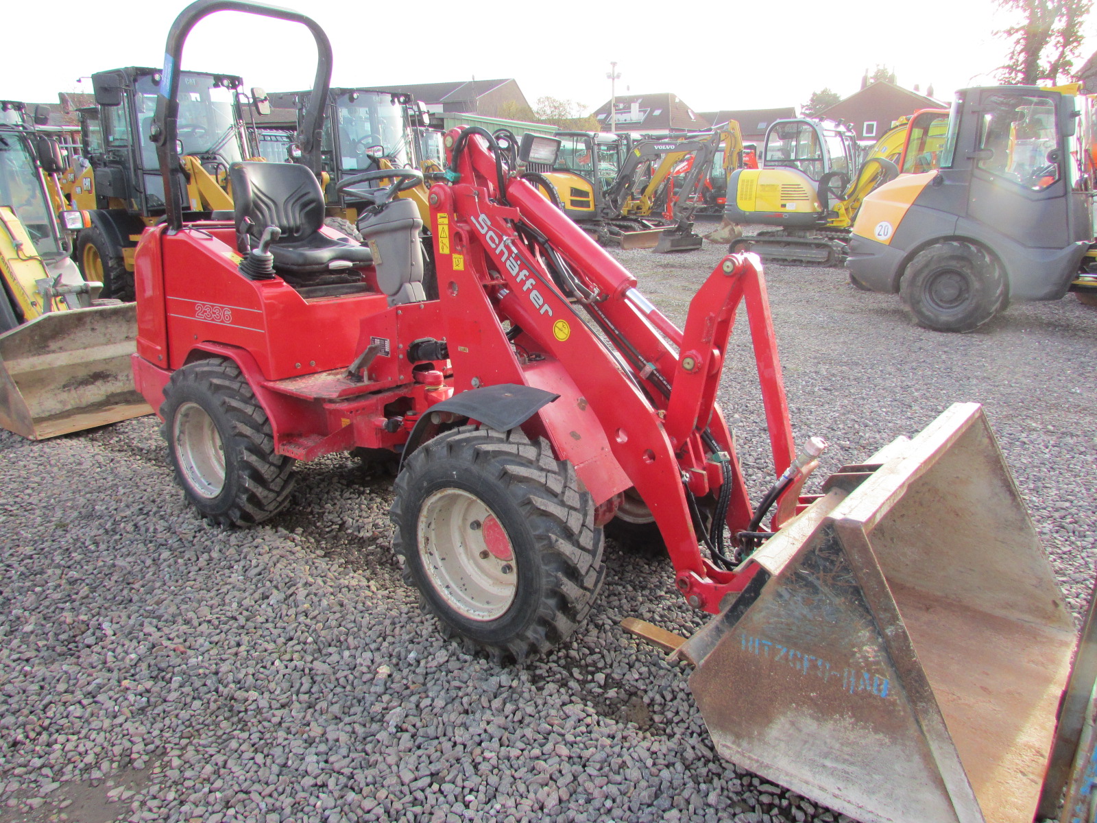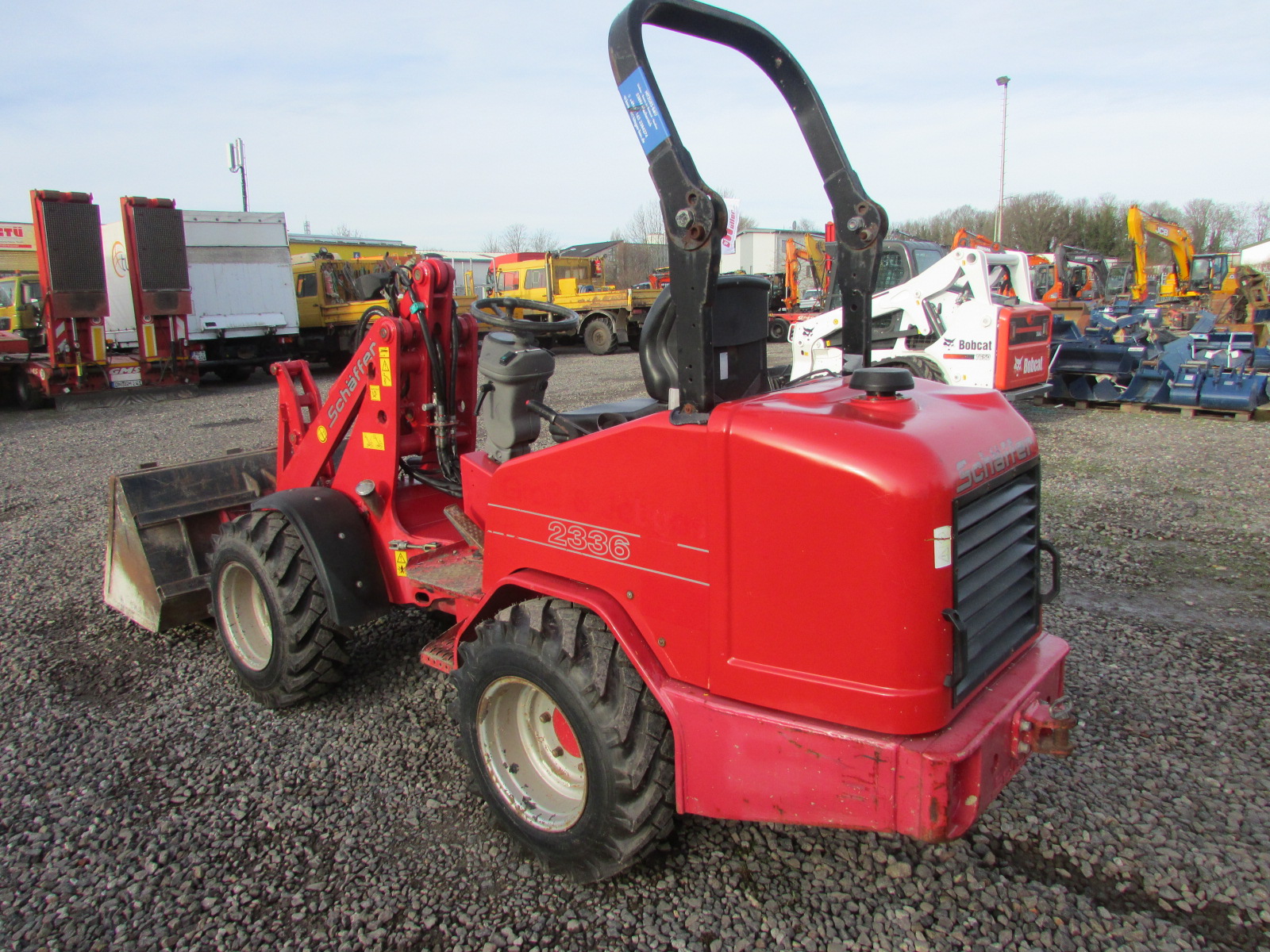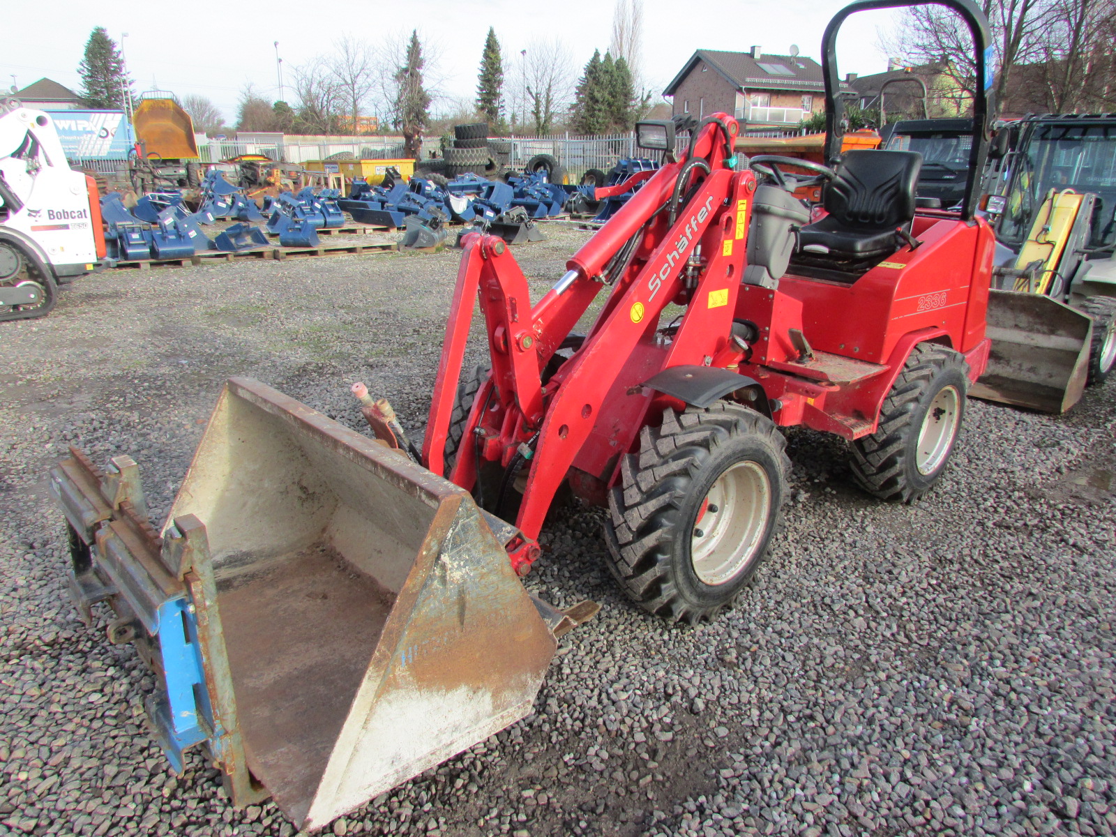 Schäffer 2336 Baujahr 2010. 2640 h, Betriebsgewicht 2200 kg, Motorleistung 26 kW, Arbeitsscheinwerfer, hydraulischer Schnellwechsler, Palettengabel, Schaufel, ROPS / Schutzbügel, 3. Steuerkreis, 4 neue Reifen, Hubkraft ca. 1700 kg