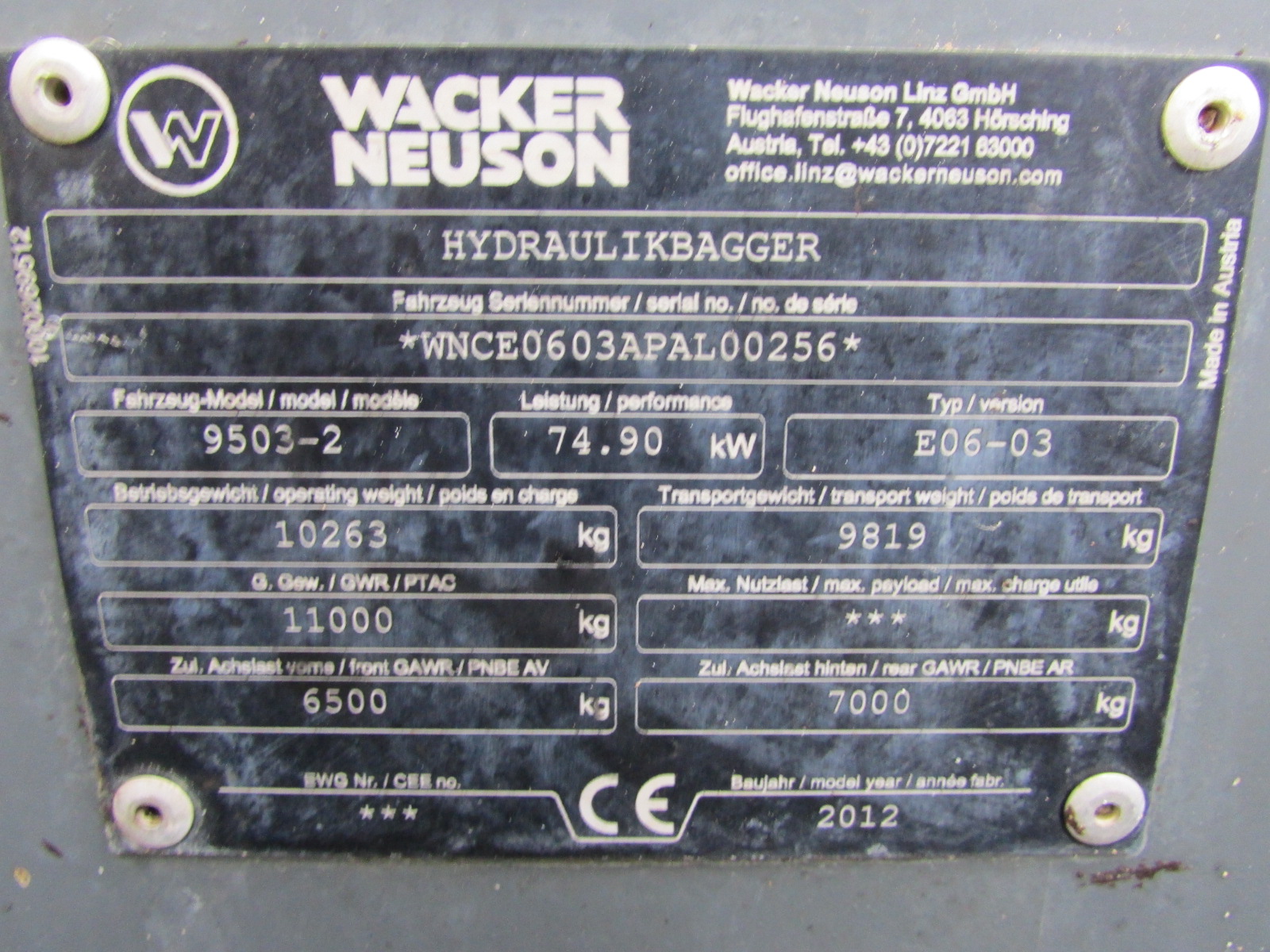 Wacker Neuson 9503-2 Baujahr 2012, 4152 h, Betriebsgewicht 10263 kg, Motorleistung 74,9 kW, Schnellwechsler Lehnhoff MS 08, 1 Tieflöffel, Lasthaken, Arbeitsscheinwerfer, Schildabstützung, 2 Zusatzsteuerkreise AUX 1 + AUX 2, Verstellausleger, Radio