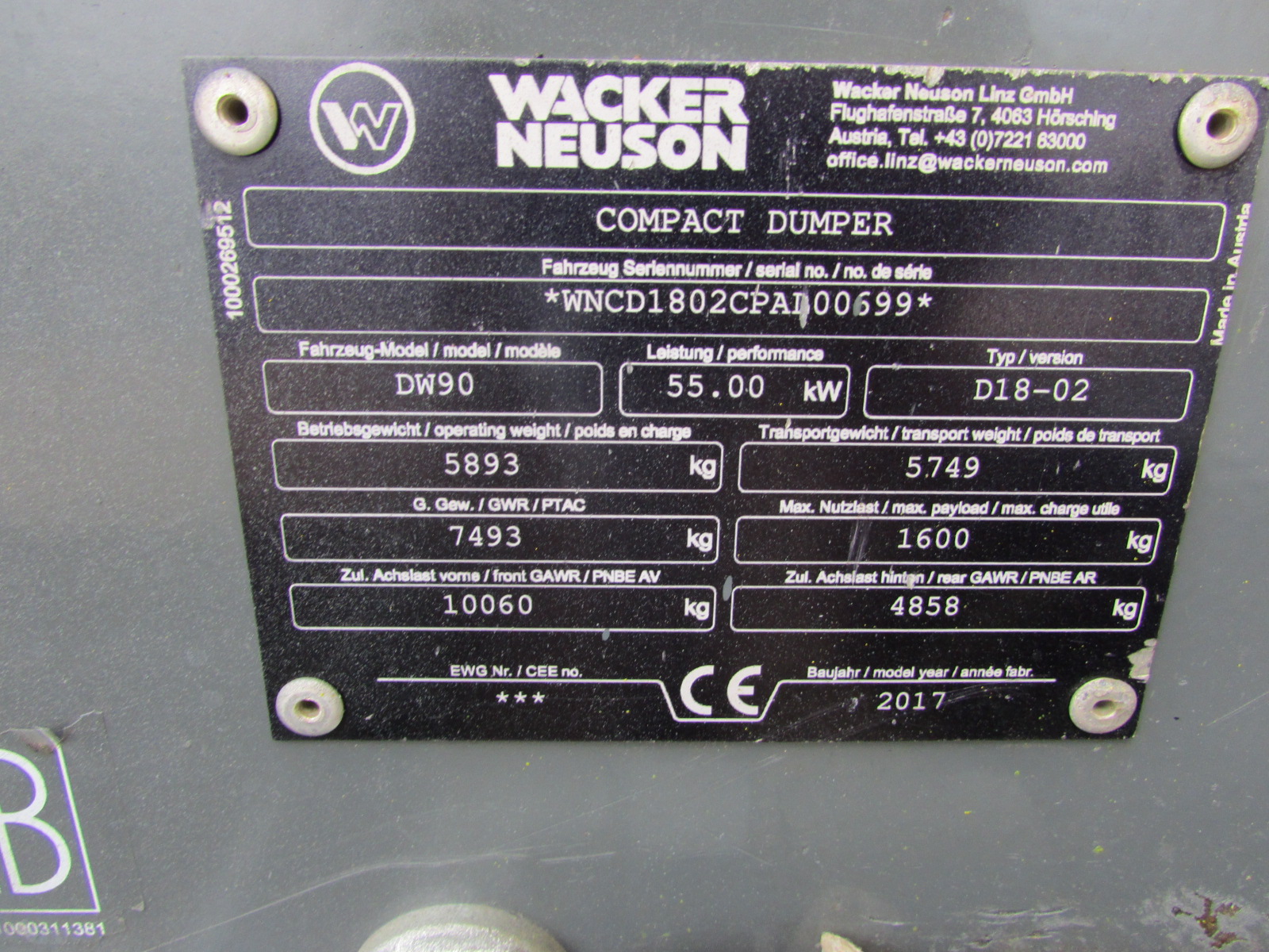 Wacker Neuson DW 90 (Typ D18-02) Baujahr 2017, 2444 h, Betriebsgewicht 5893 kg, Nutzlast 9000 kg, Drehkippmulde, Bereifung 60%, 55 kW Motorleistung, Schnellläufer, Rückfahrwarner, Radio, Vollkabine mit Heizung, Arbeitsscheinwerfer vorne und hinten, deutsche Zulassungspapiere, TUV bis 05/25